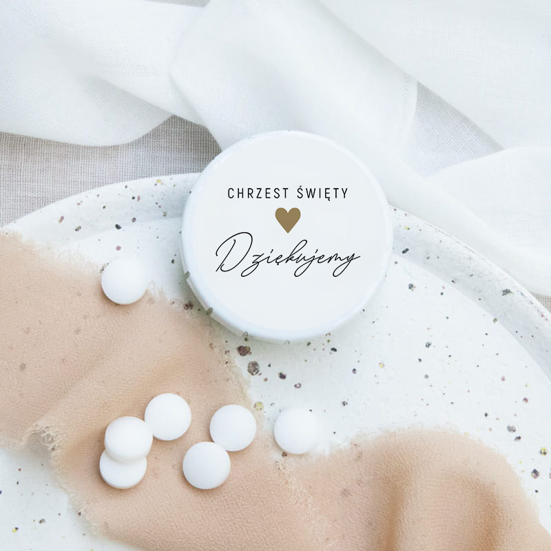 Wyjątkowe miętówki zapakowane są w stylowe, białe pudełeczko, na którym widnieje napis Chrzest Święty oraz serdeczne Dziękujemy z małym, złotym sercem dodającym szczególnego wyglądu. Pudełko jest nie tylko praktyczne, ale również estetyczne, dzięki swojej minimalistycznej elegancji i delikatnej palecie kolorów, które komponują się z klasycznym charakterem uroczystości chrztu.