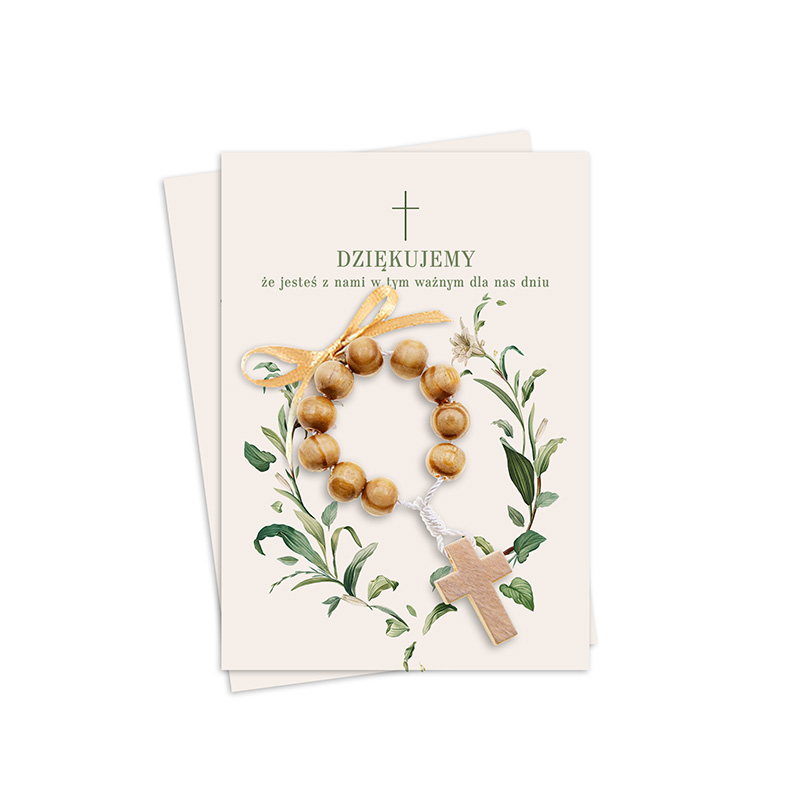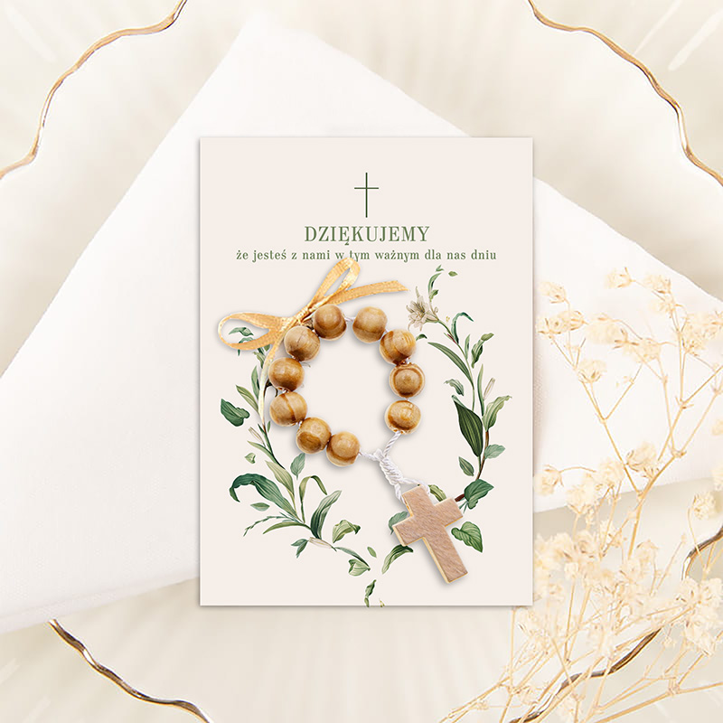 - Drewniany różaniec, w ciemnobrązowym kolorze, zakończony małym krzyżykiem, całość nawleczona jest na sznurku, który przy krzyżyku zawinięty jest w ozdobny splot. Dziesiątka różańca posiada ozdobne opakowanie, które dodatkowo tworzy dekoracyjne tło do drewienek. Na bileciku widnieją podziękowania dla gości: Dziękujemy, że jesteś z nami tym ważnym dla nas dniu. Ponadto na białym tle karteczki jest kompozycja, którą tworzą kwiaty lilii, na długich łodygach z dorodnymi listkami. Kwiaty łączą się i tworzą otwarty wianuszek. W środku florystycznego zdobienia jest miejsce, na różaniec. Ozdobna kartka tworzy eleganckie tło do małego różańca, a całość tworzy elegancki i gustownie zapakowany prezencik.