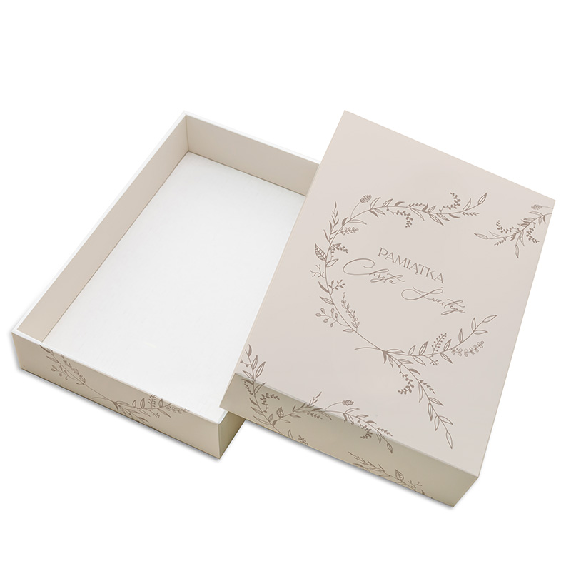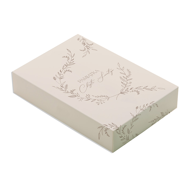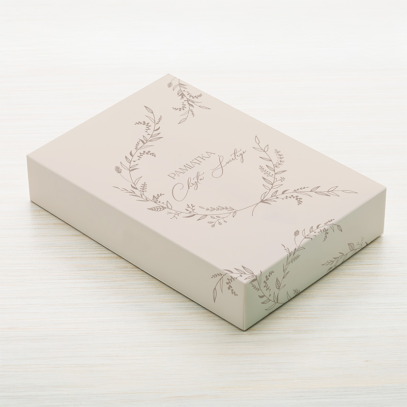 Wieczko ozdobione jest delikatnym, roślinnym motywem oraz napisem „Pamiątka Chrztu Świętego”, co nadaje całości uroczystego charakteru i pasuje do okazji. Jasna, stonowana kolorystyka sprawia, że pudełko sprawdzi się zarówno dla chłopca, jak i dla dziewczynki.
