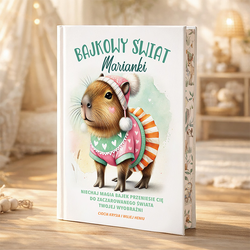 Odkryj magiczny świat bajek stworzony specjalnie dla Twojego dziecka dzięki naszej personalizowanej książce z motywem kapibary. Dzieci uwielbiają opowiadania, które pobudzają wyobraźnię i rozwijają ich kreatywność. Nasza książka pozwala na dodanie imienia dziecka, co sprawi, że stanie się ona wyjątkowym skarbem. Dzięki wyjątkowym ilustracjom każde przeczytanie tej książki będzie niezapomnianym przeżyciem. Personalizacja czyni ten produkt idealnym prezentem na różnorodne okazje. Zamień zwykłe wieczory w magiczne chwile i podaruj swojemu dziecku książkę, która ożywi jego sny oraz inspiruje na lata.