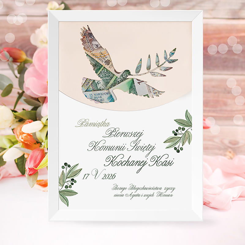Plakat w ramce na pieniądze prezent komunijny GOŁĄBEK z gałązką
