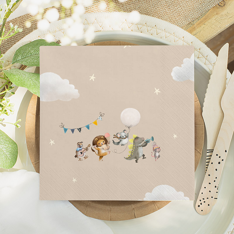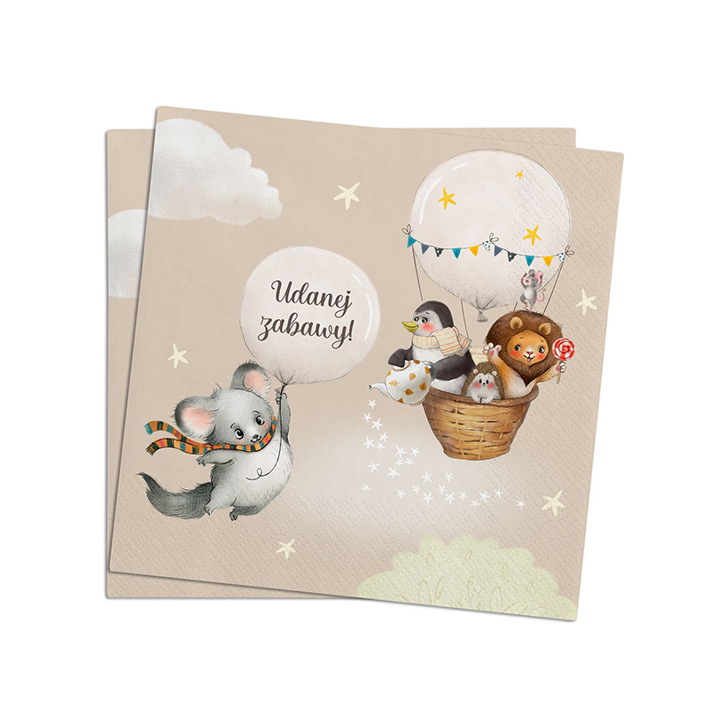 Papierowe serwetki z grafiką zwierzątek i napisem Udanej zabawy! Piękna dekoracja stołu na roczek, urodzinki, baby shower!