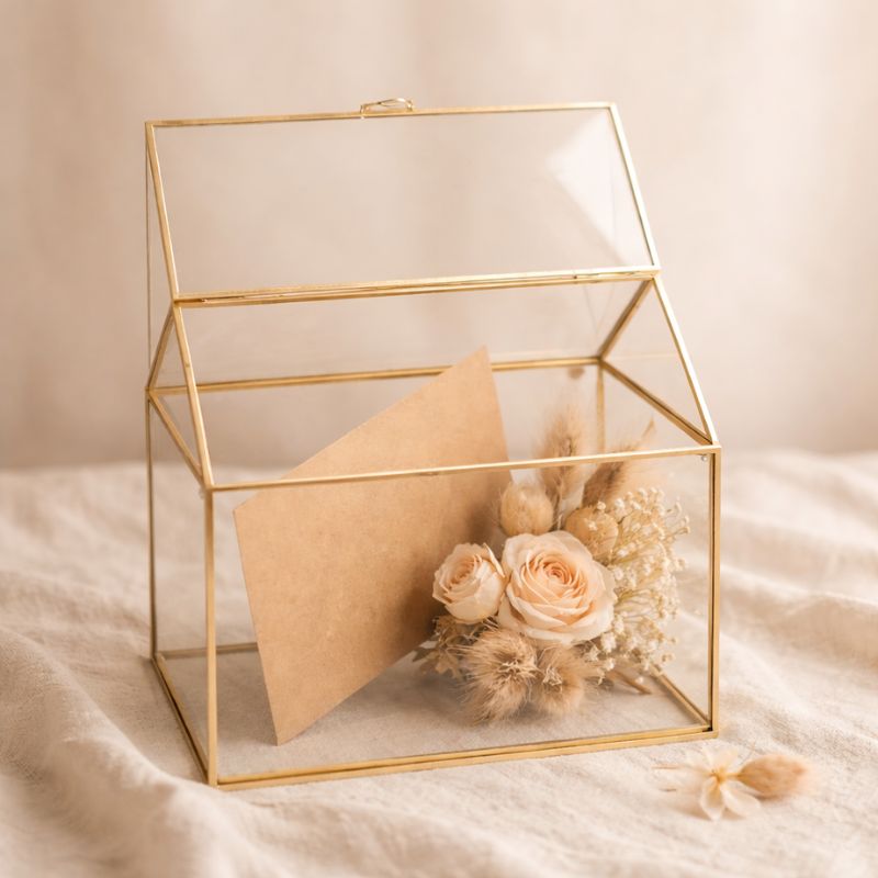 Szklane pudełko w ciekawym kształcie domku posiada złote obramowanie. Idealnie sprawdzi się jako dekoracja podczas uroczystego przyjęcia. Pudełko można wykorzystać jako miejsce na przechowanie kartek z życzeniami, wpisami od zaproszonych gości. Skrzynka na pewno ułatwi zebranie życzeń od gości, ponieważ będą umieszczone w jednym miejscu.