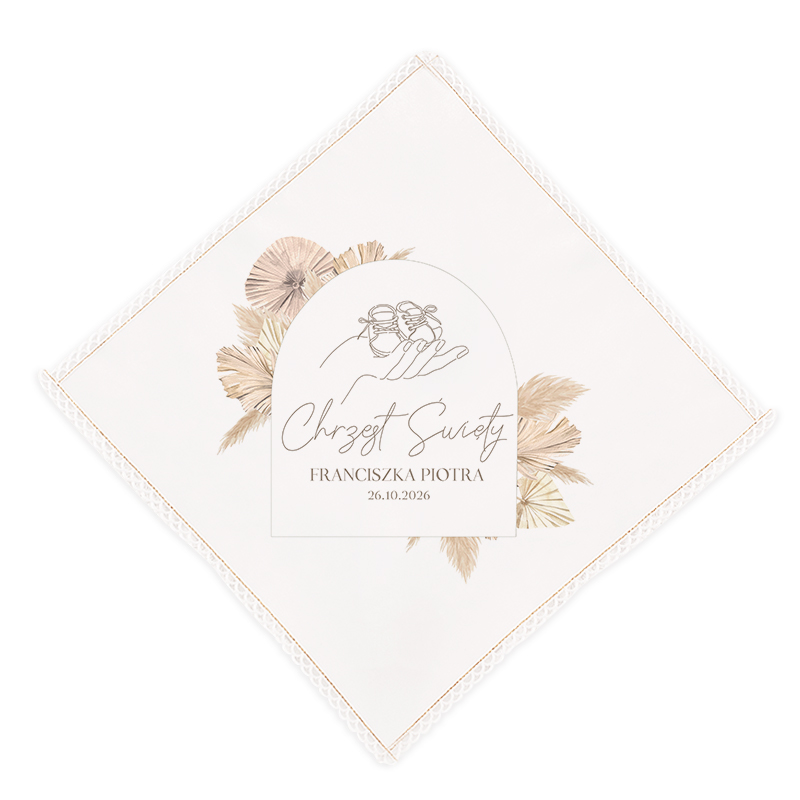 Szatka chrzcielna w kształcie rombu, która stanie się nie tylko elementem sakramentalnej ceremonii, ale i elegancką pamiątką tego świętego dnia. Została wykonana z największą starannością, zdobiona imieniem dziecka i datą tej wyjątkowej ceremonii.