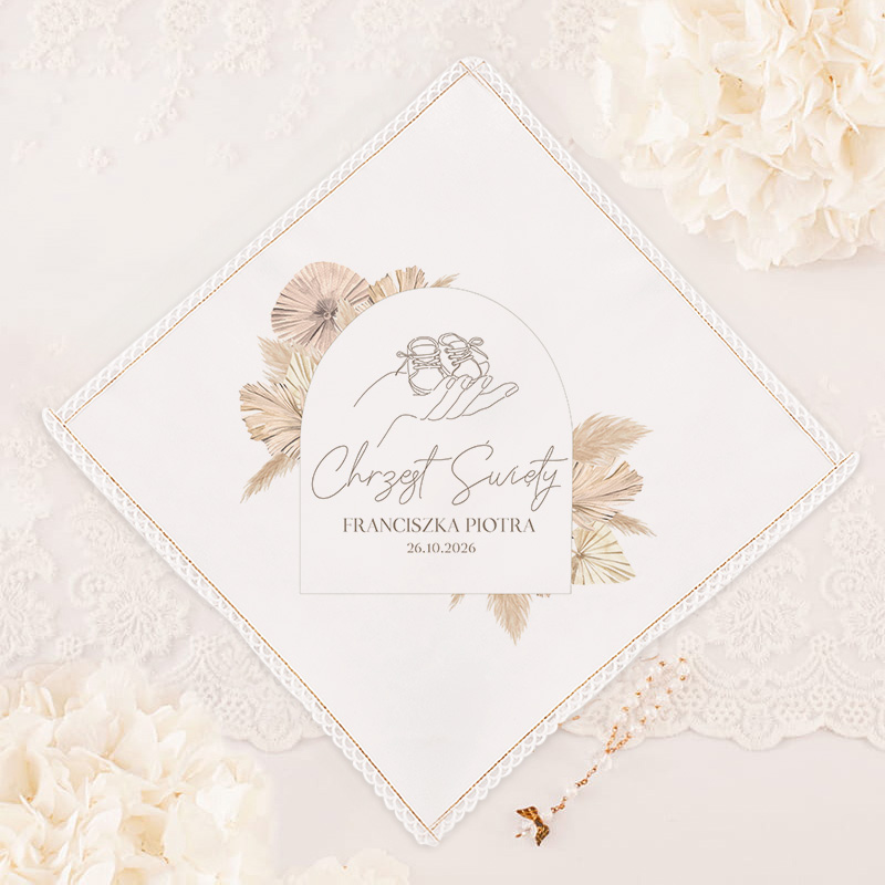 Szatka dla dziecka na Chrzest Święty. Chusteczka z imieniem i datą uroczystości.