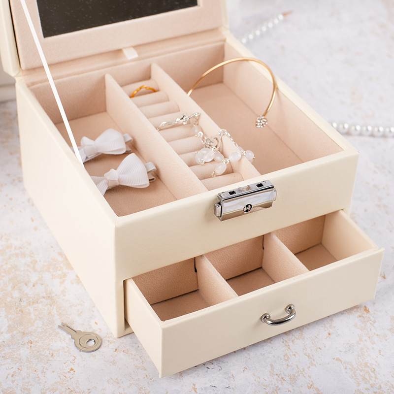 Wewnątrz szkatułki znajdują się praktyczne przegródki i lusterko, które porządkują drobiazgi i ułatwiają codzienne korzystanie. Górna część zamykana jest na kluczyk, co doceni każda dziewczynka dbająca o swoje skarby. W środku znajdują się różnej wielkości przegródki na biżuterię — zarówno większe spinki czy gumki do włosów, jak i specjalny segment na pierścionki. Dzięki wysuwanej szufladce każdy z drobiazgów będzie zawsze na wyciągnięcie ręki, co jest ważne dla młodej damy dbającej o swój styl od najmłodszych lat życia.