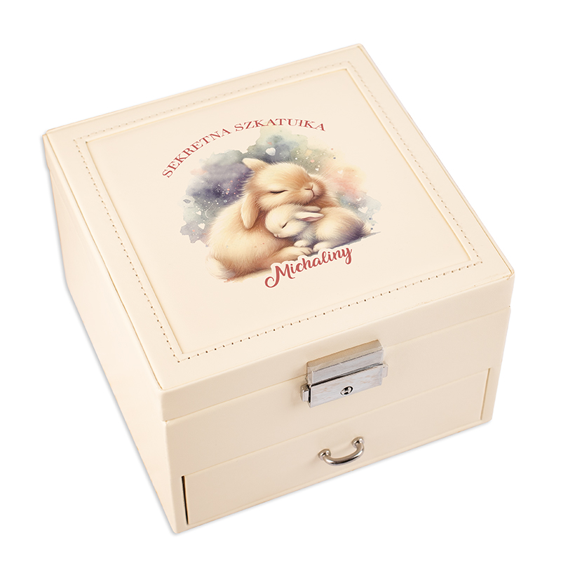 Personalizowany kuferek na Dzień Dziecka zamykany na kluczyk, doskonały prezent dla każdej młodej damy. Szkatułka na biżuterię z imieniem dziewczynki to wyjątkowy prezent z okazji Dnia Dziecka, który łączy w sobie funkcjonalność, estetykę i osobisty charakter. Na wieczku znajduje się subtelna grafika pary przytulających się zajączków – motyw, który podkreśla dziecięcą delikatność.