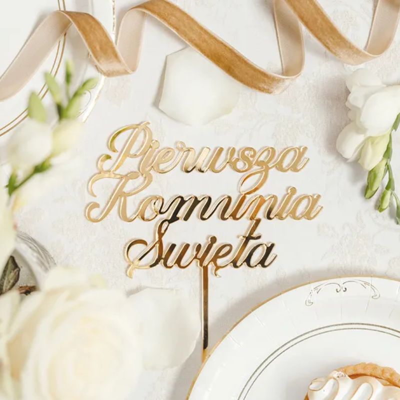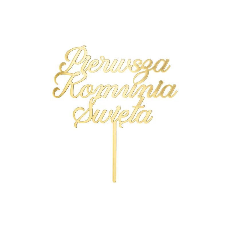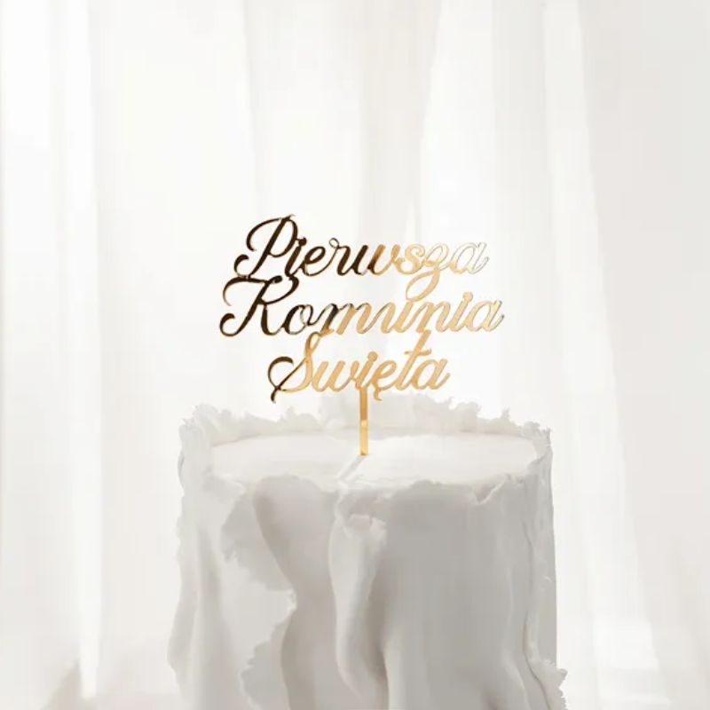 Piękny, złoty topper akrylowy z napisem "Pierwsza Komunia Święta", wykonanym ozdobną czcionką idealnie wpisuje się w komunijną kolorystykę, dzięki czemu pasuje do każdego rodzaju tortu komunijnego. Topper wykonany jest z akrylu oraz posiada jeden punkt podparcia którym jest ostro zakończony patyczek, co sprawia, że stabilnie trzyma się on w strukturze tortowej. Jest wspaniałą alternatywą dla wszelkiego rodzaju ozdób umieszczanych bezpośrednio na torcie, w odpowiedniej kompozycji może być również ich uzupełnieniem.