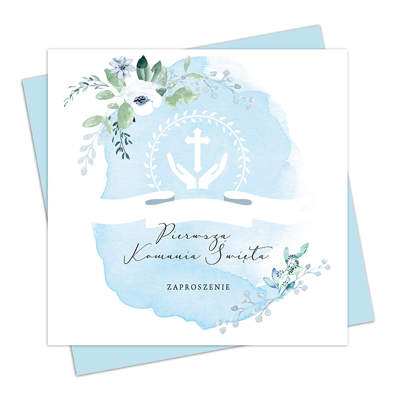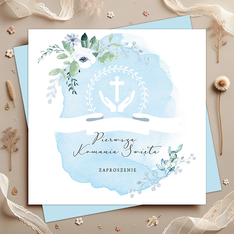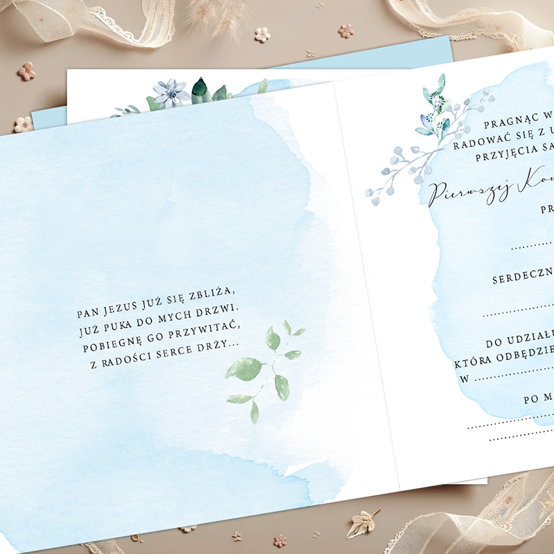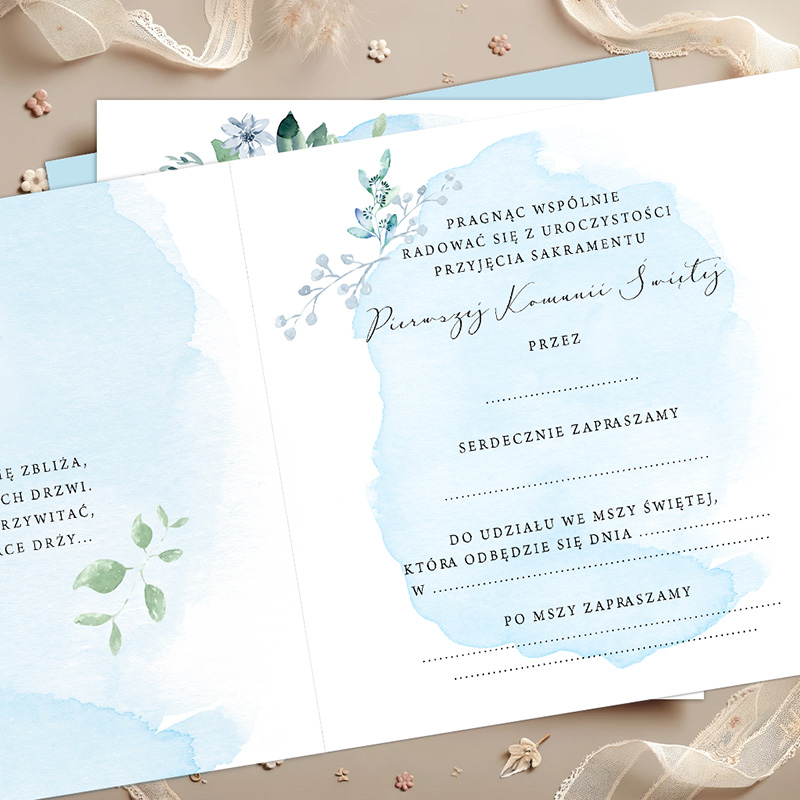 ZAPROSZENIA uniwersalne na Komunię Błękitne Gałązki 10szt