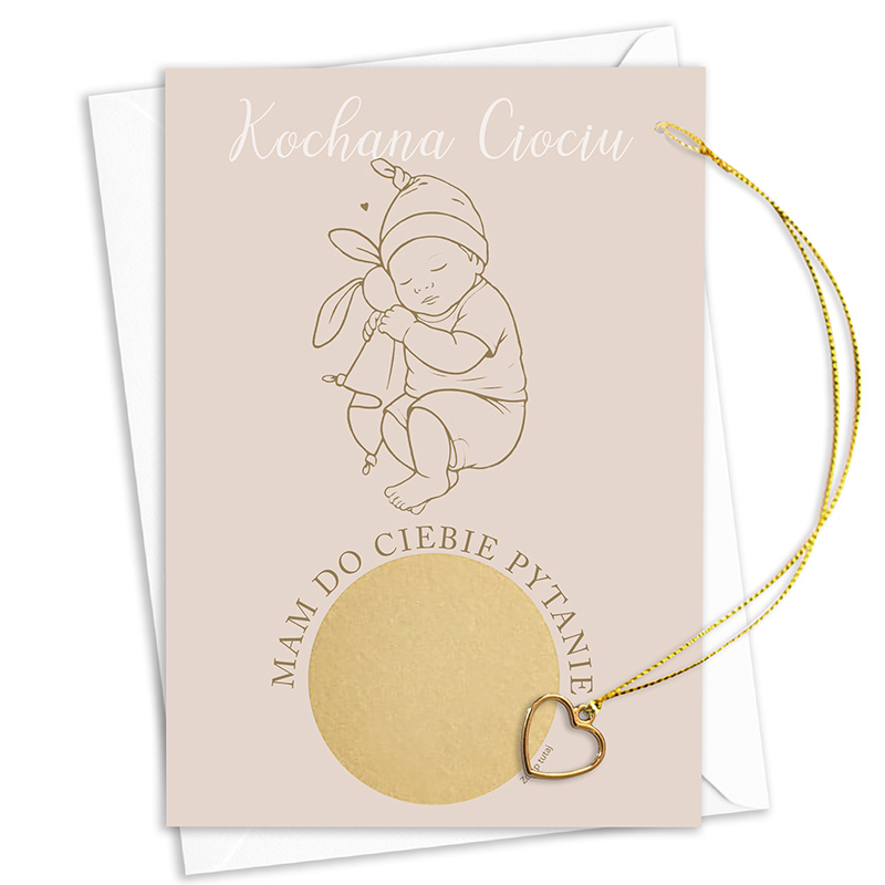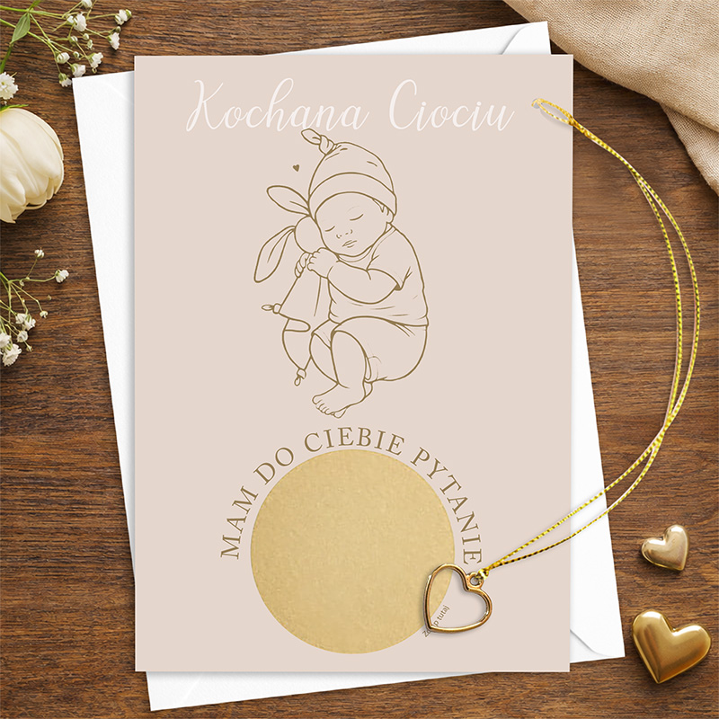Zdrapka z pytaniem dla Mamy Chrzestnej od chłopca została starannie zaprojektowana, zwracając uwagę na każdy detal. Ukazuje ona spokojnie śpiącego chłopca, który przytula swojego pluszowego przyjaciela. Na górnej części karty, elegancko napisane "Kochana Ciociu" w czcionce przypominającej ręczne pismo, dodaje osobisty akcent. Nad złotym, okrągłym polem do zdrapywania znajduje się zaproszenie "Mam do Ciebie pytanie". Po zdrapaniu odsłania się wzruszające pytanie "Czy zostaniesz moją Mamusią Chrzestną?", które z pewnością sprawi radość i wzruszenie. Zdrapka wyposażona jest także w praktyczną zawieszkę do zdrapywania i jest elegancko zapakowana w kopertę.