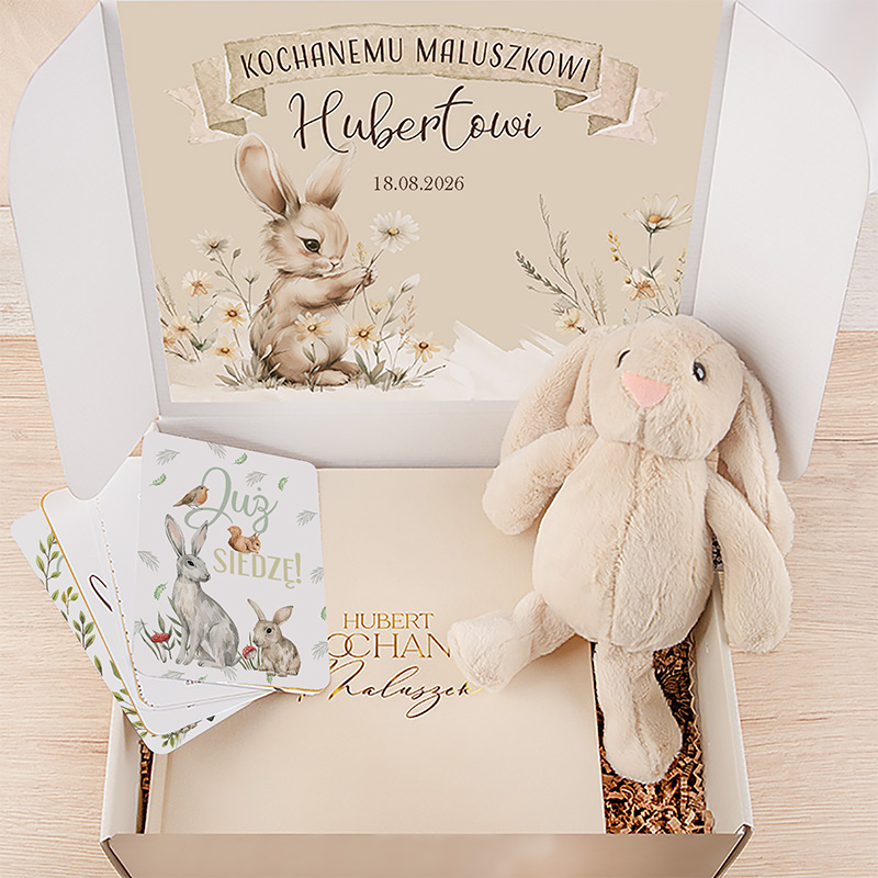 Zestaw prezentowy na narodziny to harmonijne połączenie elegancji i funkcjonalności. W zestawie znajdziesz mięciutkiego pluszowego króliczka, który szybko stanie się najlepszym przyjacielem maluszka. Króliczek ma długie uszy i delikatne futerko, które jest idealne do tulenia i przytulania. Obok króliczka, w zestawie znajduje się również welurowy album na zdjęcia z pozłacanym napisem na okładce. Personalizacja w postaci imienia dziecka dodaje albumowi wyjątkowego charakteru, czyniąc go bezcenną pamiątką na całe życie. Album jest starannie wykonany i przeznaczony do przechowywania najpiękniejszych wspomnień z pierwszych chwil życia dziecka. Dodatkowym elementem zestawu są karty do zdjęć Mój Pierwszy Rok Życia. Pięknie zaprojektowane karty pomogą rodzicom uwiecznić najważniejsze momenty i osiągnięcia maluszka w jego pierwszym roku życia. Każda karta jest estetycznie wykonana i jest doskonałym uzupełnieniem albumu, tworząc spójną i elegancką całość. Całość zestawu jest zapakowana w eleganckie kraftowe pudełko z bajkową grafiką króliczka i napisem Z NAJLEPSZYMI ŻYCZENIAMI. Pudełko jest praktyczne oraz estetyczne, co sprawia, że zestaw prezentuje się niezwykle efektownie i jest gotowy do wręczenia bez potrzeby dodatkowego pakowania.