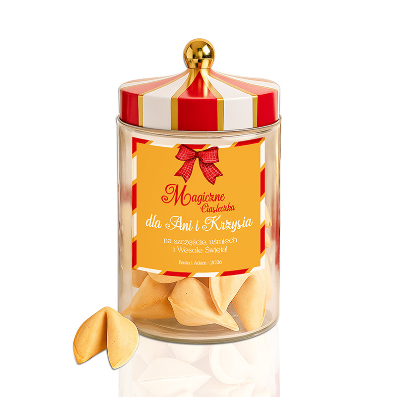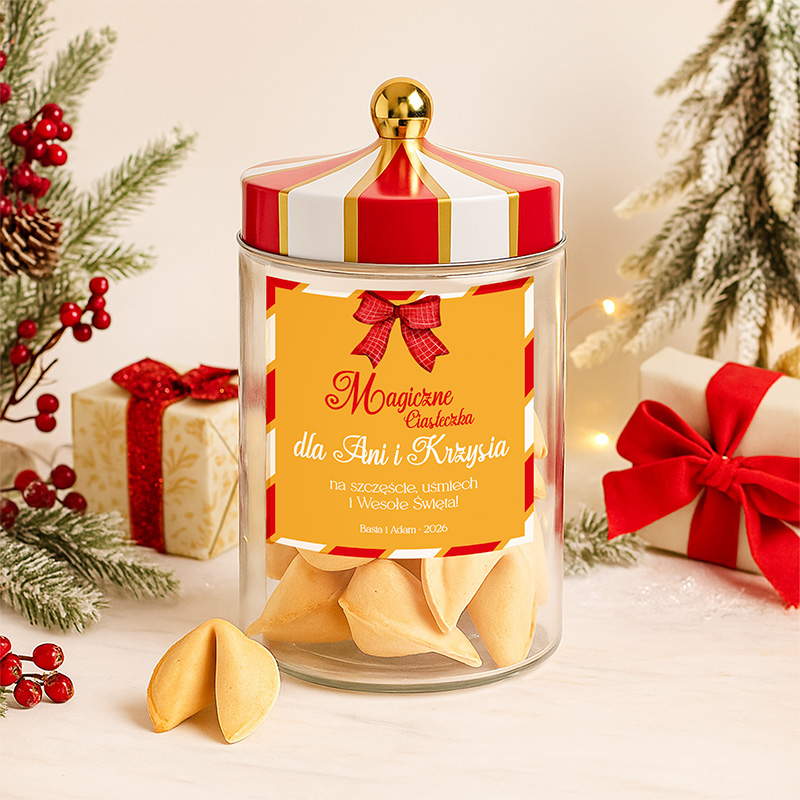 Świąteczny słoik wypełniony pysznymi ciasteczkami z wróżbą i personalizowaną etykietą  - to oryginalny pomysł na prezent świąteczny z efektem WOW. To upominek, który zaskoczy każdego obdarowanego.