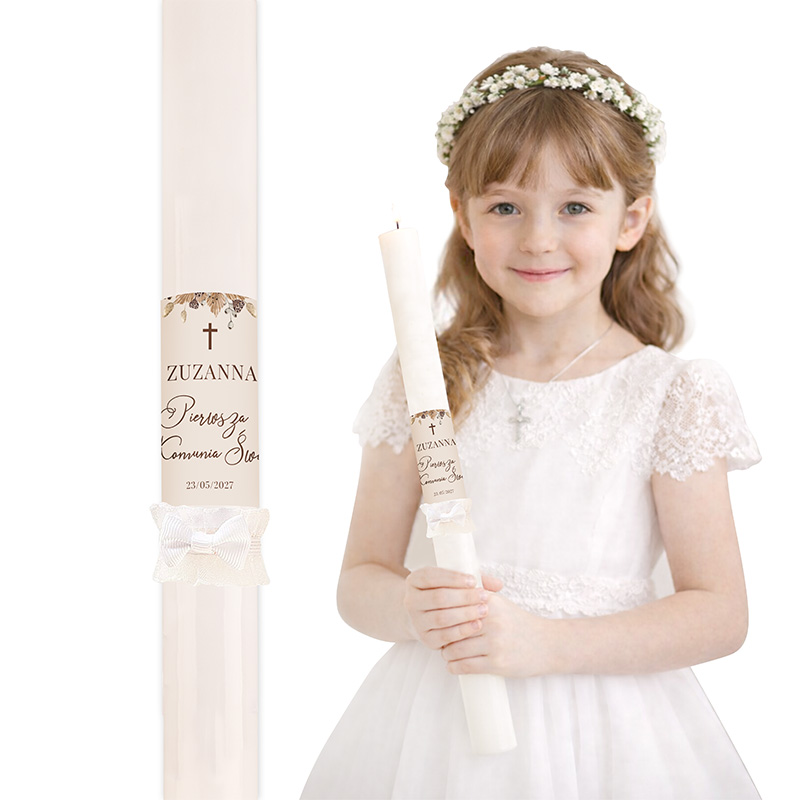 Świeca utrzymana jest w jasnej, klasycznej kolorystyce. Biała gromnica ozdobiona została etykietą z subtelnymi, brązowymi motywami roślinnymi w stylu boho oraz niewielkim krzyżykiem. Na etykiecie widnieje imię dziecka, napis „Pierwsza Komunia Święta” oraz data uroczystości. Dodatkową dekorację stanowi delikatna kokardka z jasnej wstążki i koronki umieszczona na dole ozdoby. Personalizacji podlega imię oraz data komunii.