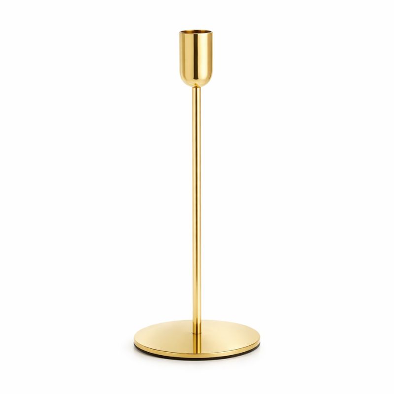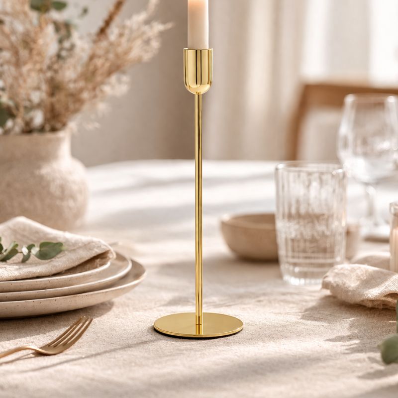 Świecznik jest metalowy w eleganckim złotym kolorze, dzięki czemu stanowi stylowy element dekoracyjny. Jego minimalistyczna, smukła konstrukcja sprawia, że doskonale komponuje się z różnymi dekoracjami stołu, takimi jak kwiaty, bieżniki czy elegancka zastawa.
