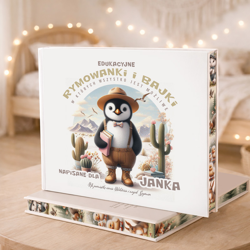 Personalizowane bajki i wierszyki dla dziecka to zbiór edukacyjnych opowiadań i wierszyków z morałem, które zostały stworzone z myślą o najmłodszych czytelnikach. Na okładce znajduje się sympatyczna postać pingwina w eleganckim kapeluszu i szelkach, trzymającego książki. Całość kompozycji uzupełniają ciepłe, pastelowe kolory oraz tło w postaci pustynnego krajobrazu z kaktusami i górami, co nadaje książce niepowtarzalnego charakteru. Obok grafiki znajduje się imię dziecka, np. „Janka”, które podkreśla indywidualny charakter książki. Tytuł „Rymowanki i Bajki, w których wszystko jest możliwe” wprowadza w świat nieskończonych możliwości, gdzie każde dziecko może stać się bohaterem. Dedykacja na dole okładki, np. „Na pamiątkę ciocia Wiktoria i wujek Szymon”, dodaje książce osobistego i sentymentalnego wymiaru. Każda strona tej publikacji to starannie zaprojektowane historie oraz kolorowe ilustracje, które przyciągają uwagę dziecka. Bajki uczą ważnych wartości, takich jak odwaga, przyjaźń czy uczciwość, a rymowanki wprowadzają elementy zabawy językowej, rozwijając przy tym słownictwo. Twarda oprawa i wysokiej jakości papier zapewniają trwałość i estetykę, dzięki czemu książka przetrwa jako pamiątka na długie lata.
