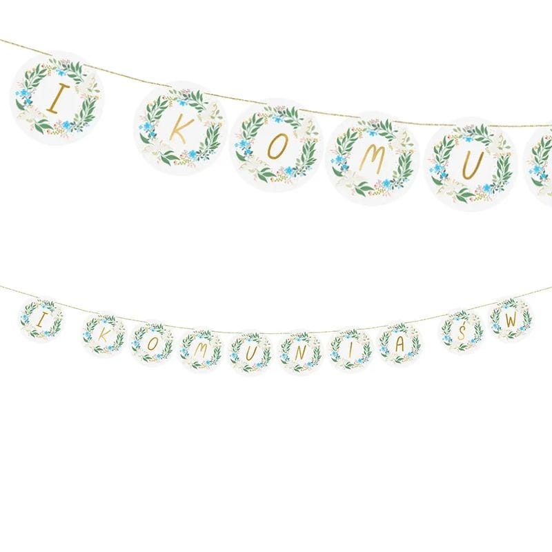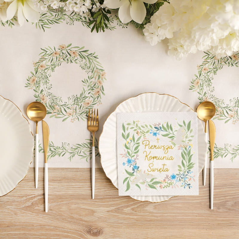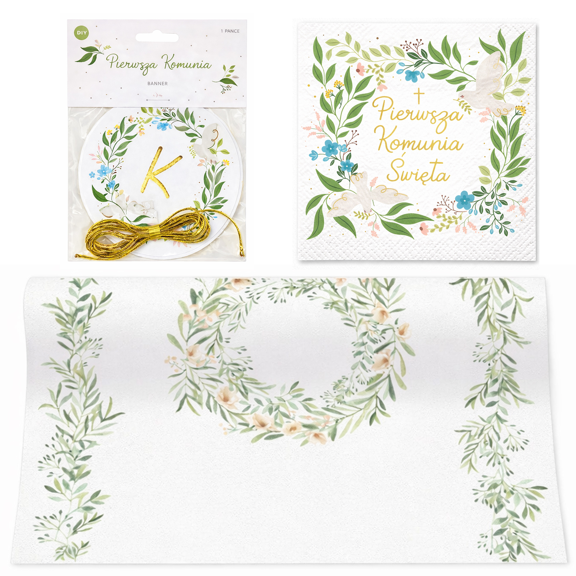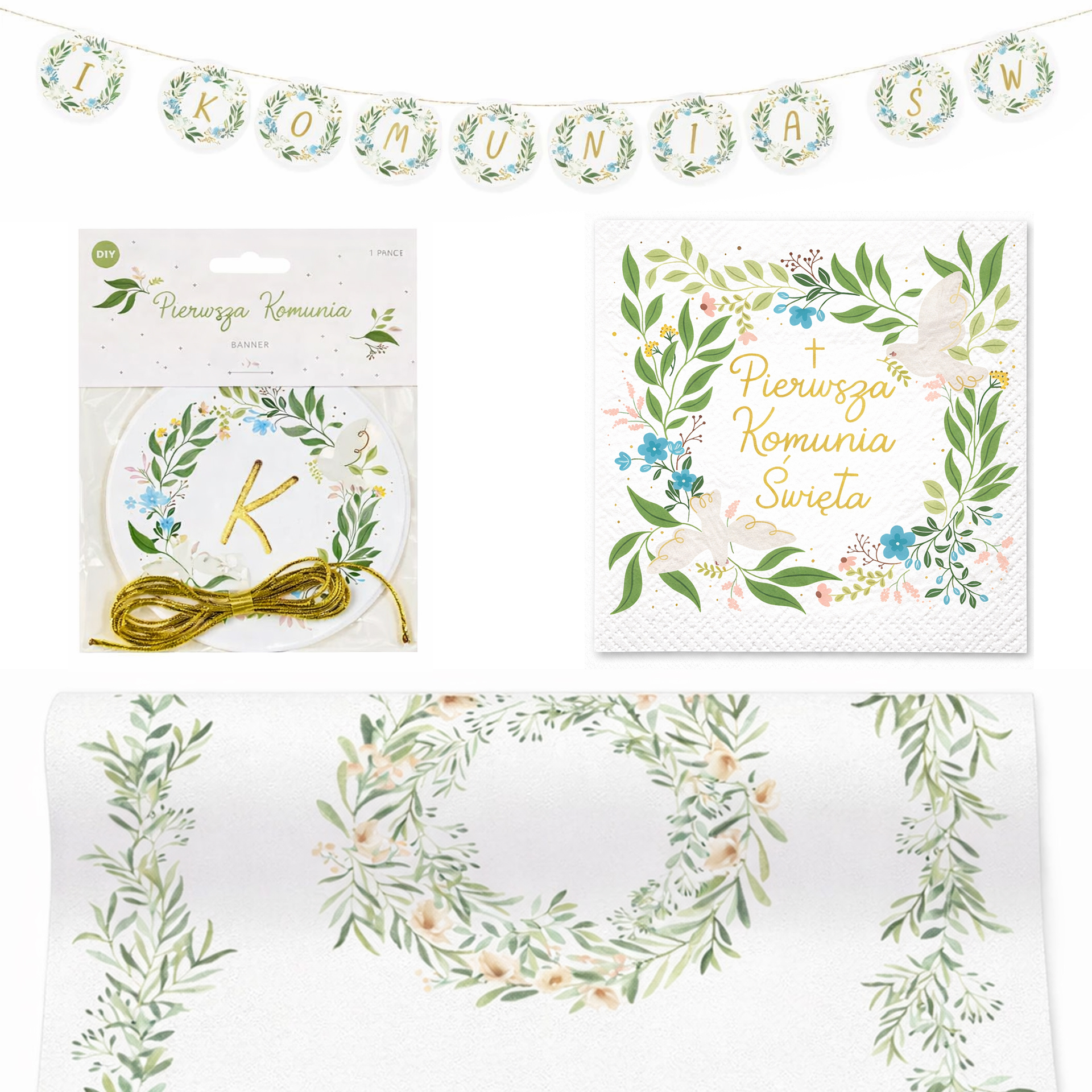 W komplecie znajdziesz bieżnik z delikatnym, roślinnym motywem, serwetki z napisem „Pierwsza Komunia Święta” oraz dekoracyjny baner do zawieszenia. Całość utrzymana jest w jasnej kolorystyce z zielonymi gałązkami, subtelnymi kwiatami i złotymi akcentami, które nadają dekoracjom lekkości i elegancji. Styl inspirowany naturą sprawia, że zestaw wygląda nowocześnie, a jednocześnie bardzo uroczyście.