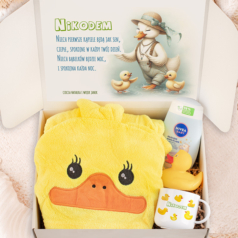 Zestaw kąpielowy z kaczuszką dla maluszka to uroczy i praktyczny pomysł na prezent, który sprawdzi się idealnie na narodziny dziecka, baby shower czy pierwsze odwiedziny u noworodka.
