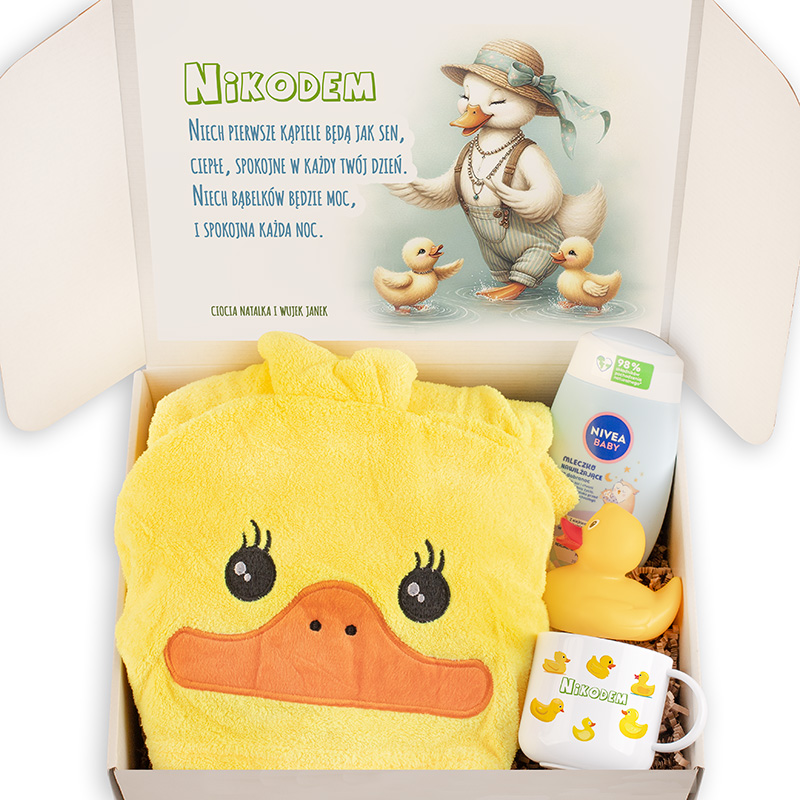 W zestawie znajduje się mięciutki ręcznik z kapturkiem w kształcie kaczuszki, który delikatnie otula maluszka po kąpieli i zapewnia mu komfort oraz ciepło. Dodatkowo w komplecie znajduje się plastikowy kubeczek z imieniem, klasyczna gumowa kaczuszka do zabawy w wodzie oraz mleczko nawilżające dla dziecka, które pomaga zadbać o wrażliwą skórę. Całość zapakowana jest w estetyczne pudełko prezentowe z grafiką zajączka, gotowe do wręczenia bez dodatkowego pakowania.