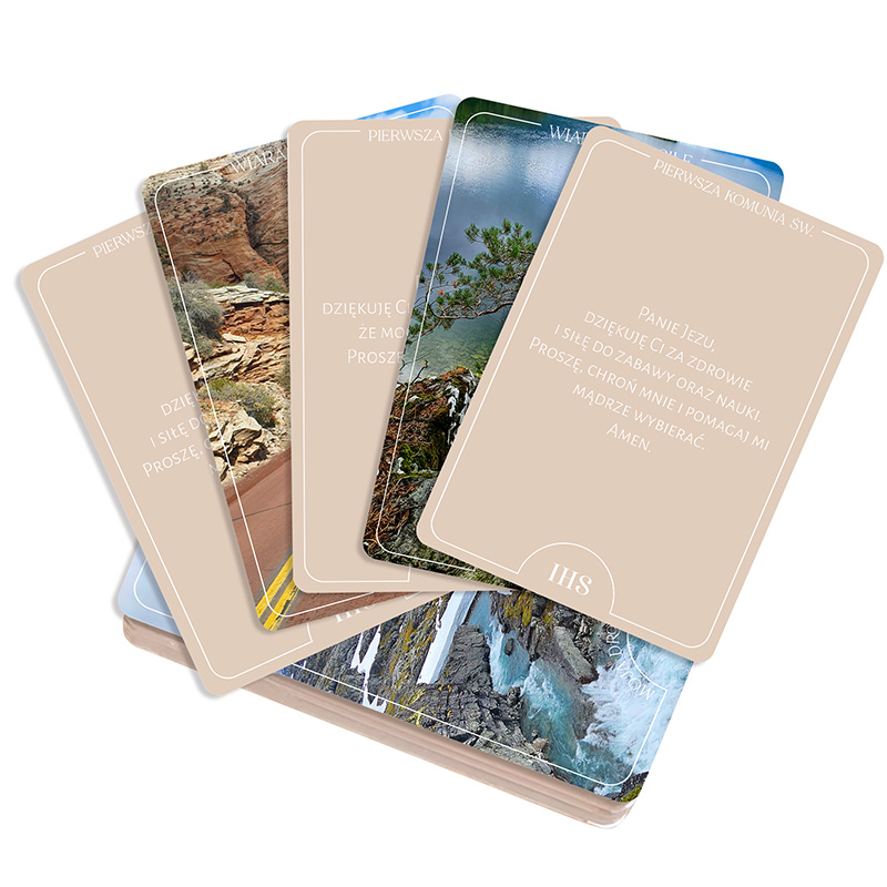 Komplet zawiera starannie zaprojektowane karty z modlitwami odpowiednimi dla dziecka przystępującego do sakramentu Eucharystii. Każda karta została wykonana z grubszego, a zaokrąglone rogi nadają całości estetycznego wykończenia. Na froncie kart znajduje się czytelnie zapisana modlitwa na jasnym, beżowym tle. Dodatkowo widoczny symbol IHS podkreśla religijny charakter zestawu. Tył kart zdobią piękne fotografie natury, takie jak góry, rzeki czy kaniony. Dopełnieniem zestawu jest drewniana podstawka z personalizacją imienia dziecka oraz napisem „Pamiątka I Komunii Świętej”. Karty mogą towarzyszyć dziecku podczas codziennej modlitwy.