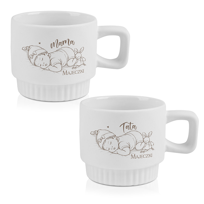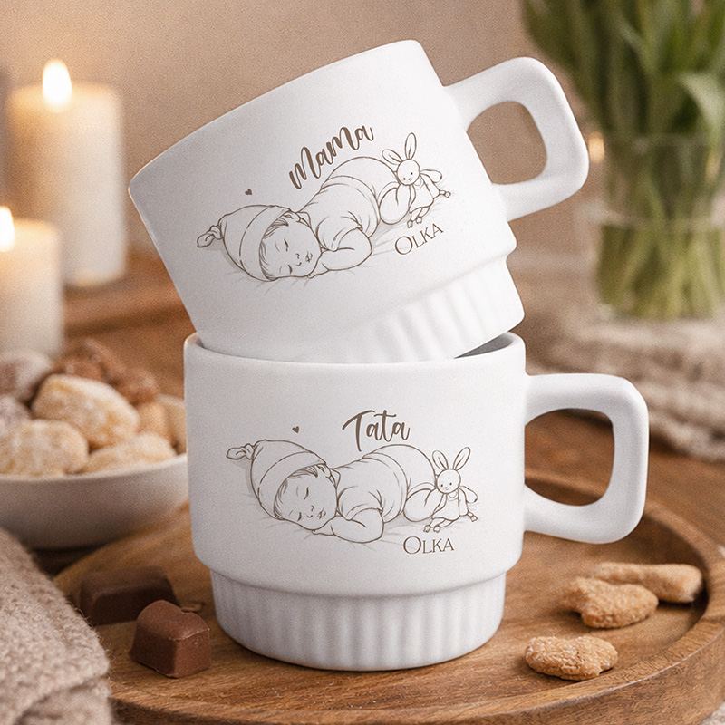 Zestaw składa się z dwóch ceramicznych kubków o eleganckiej, ryflowanej formie. Każdy kubek ozdobiony jest delikatną grafiką śpiącego maluszka oraz personalizowanym napisem „Mama” i „Tata” wraz z imieniem dziecka. Subtelny styl ilustracji sprawia, że kubki prezentują się estetycznie i pasują do różnych wnętrz. Do wyboru jest kolor kubka a także warianty dedykowane rodzicom dziewczynki lub chłopca. Solidna ceramika oraz wygodne ucho zapewniają komfort codziennego użytkowania – zarówno przy porannej kawie, jak i wieczornej herbacie.