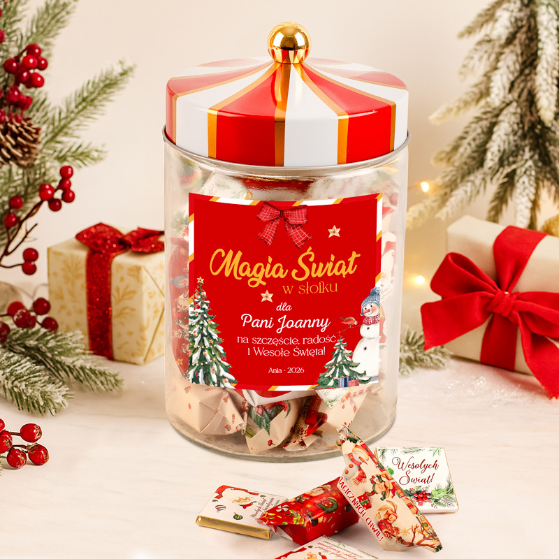 Zestaw na prezent świąteczny w formie słoika z mixem słodyczy to doskonały prezent pod choinkę dla każdego. Świąteczny szklany słoik to także doskonały wybór jako symboliczny podarunek od dziecka dla nauczycielki, dodatek do większego prezentu, ale też jako upominek pod choinkę.