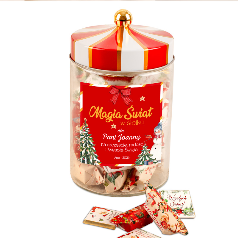 Duży szklany słoik ze słodyczami wypełniony pysznymi polskimi krówkami w świątecznych wzorach oraz świątecznymi czekoladkami. Sprawdzi się jako upominek świąteczny, który zaskoczy każdego obdarowanego.