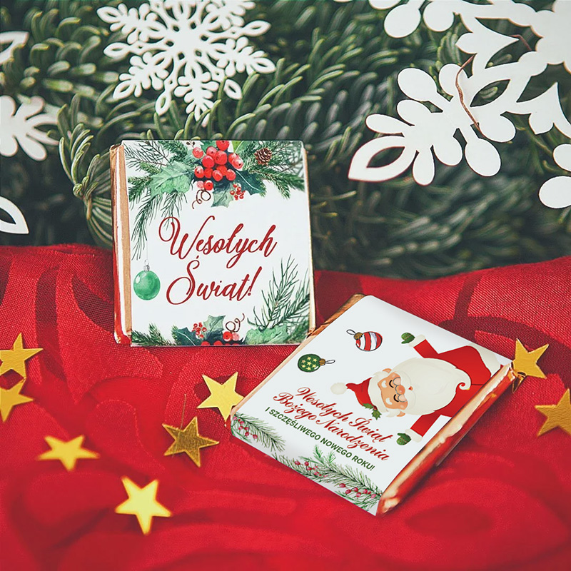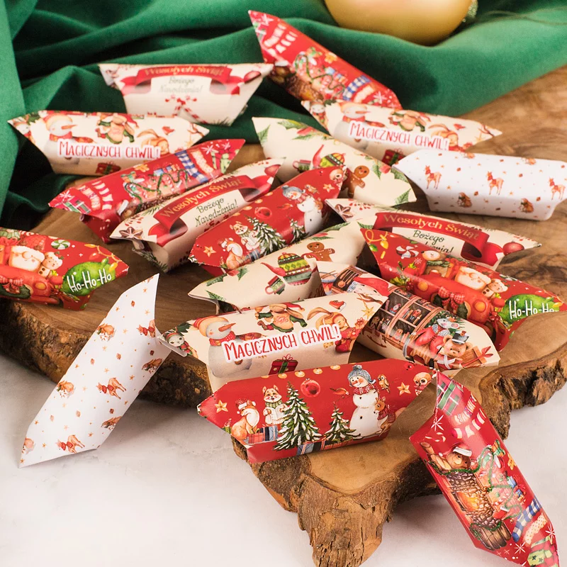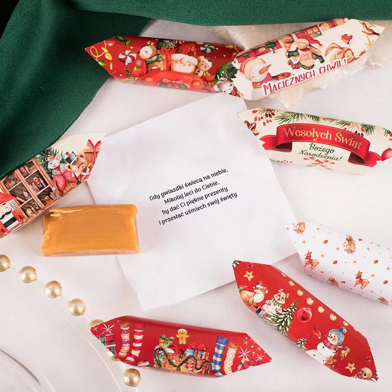 Szklany słoik z ozdobną zakręcaną pokrywką w kolorze biało-czerwonym ze złotymi elementami jak delikatne złote linie i złota kulka. W słoiku znalazły się pyszne słodkości w postaci ciągnących się krówek w papierkach ze świątecznymi grafikami. Po rozwinięciu krówki na wewnętrznej stronie papierka znajdują się różne życzenia świąteczne. Dodatkowo w słoiku znajdziecie pyszne czekoladki z mlecznej czekolady w świątecznych etykietach z grafiką Mikołaja i symboli świątecznych.